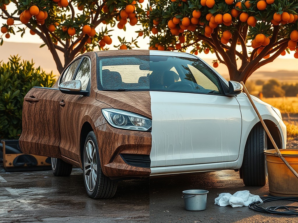 Per motivi che non sto a spiegare l’ auto è finita sotto gli alberi di arancio, con sole o pioggia.