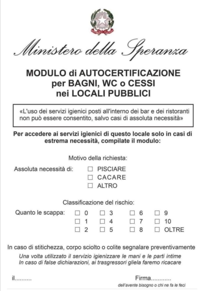 Se andate al ristorante e vi scappa (scusate) di cagare, di pisciare, e non avete voglia di cagare tra due macchine sperando che non arrivi nessuno, vi serve l’autocertificazione, ecco al voi il modulo che potete scaricare.