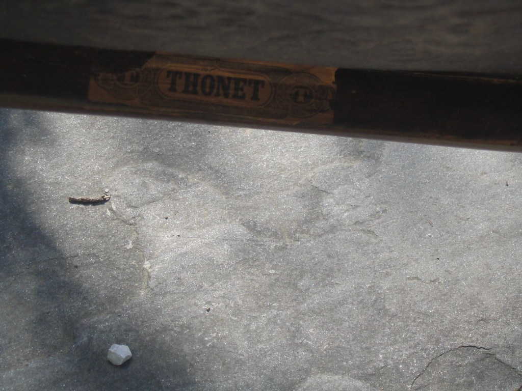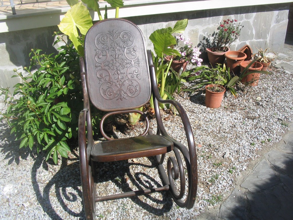 Un giorno c’era una amica di dolce consorte, un’architetto che vedendo la sedia confinata in uno spazio non degno per tale bellezza, ha detto ” ma questa è una sedia a dondolo di valore” ha detto, sorpresa della nostra ignoranza in fatto di sedie a dondolo e a riprova di ciò è andata a ricerca della ditta Thonet. Pare marchio famoso di sicuro sconosciuto a me e a dolce consorte e al vecchio proprietario che la teneva in cantina con sopra un sacco di cianfrusaglie.