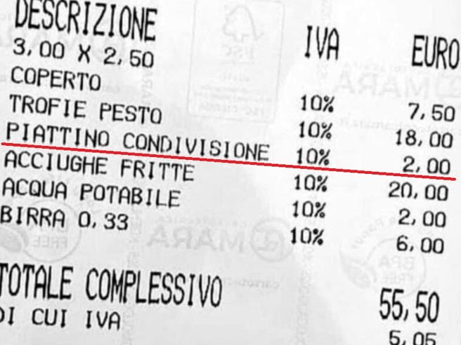 Ora a me una che mi mette un piatto di trofie di 18 euro non mi vede neanche col binocolo, ci passo lontano 30 metri altro che piattino da di dividere.. 20 euro un piatto di acciughe fritte alla faccia del pesce povero. Quindi se uno è così sprovveduto ed entrare in un locale con questi prezzi non si deve stupire che gli facciano pagare 2 euro un piatto vuoto secondo me gli è andata ancora bene.