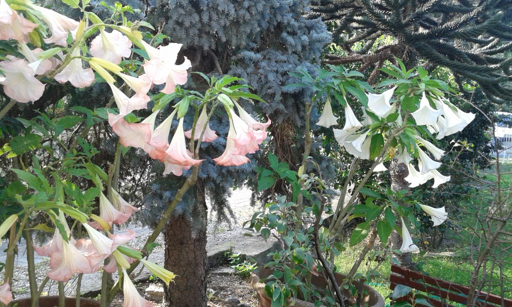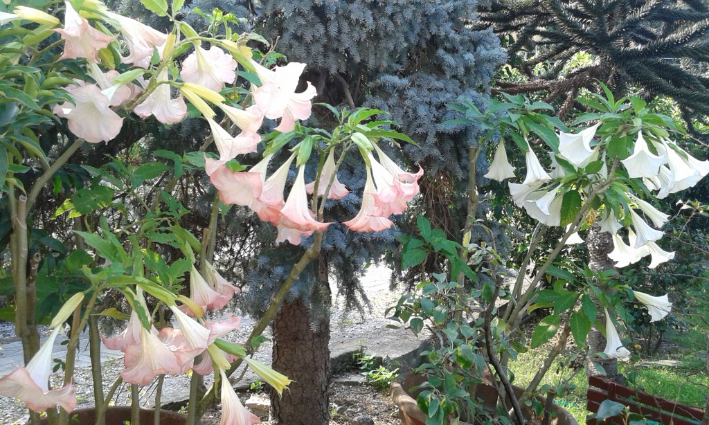 Io avevo provato a rifiutare gentilmente. So che queste piante (brugmansia detta trombone d’angelo) in estate vanno curate particolarmente e bagnate abbondantemente, c’è da faticare a tenerle. Ma dolce consorte( tanto poi le curo io) le aveva accettate.